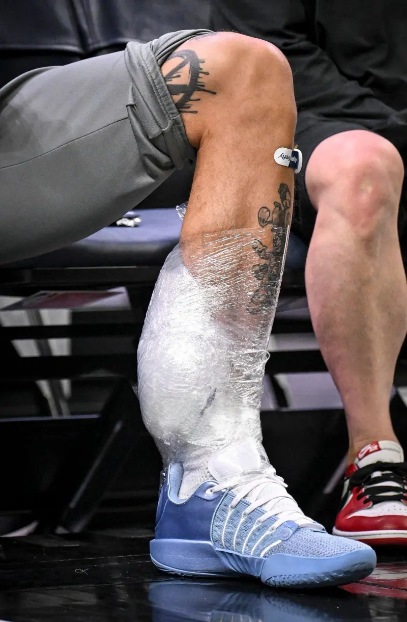 在昨日进行了一些走位训练后,戈登左小腿下方裹着厚冰袋进行冰敷。