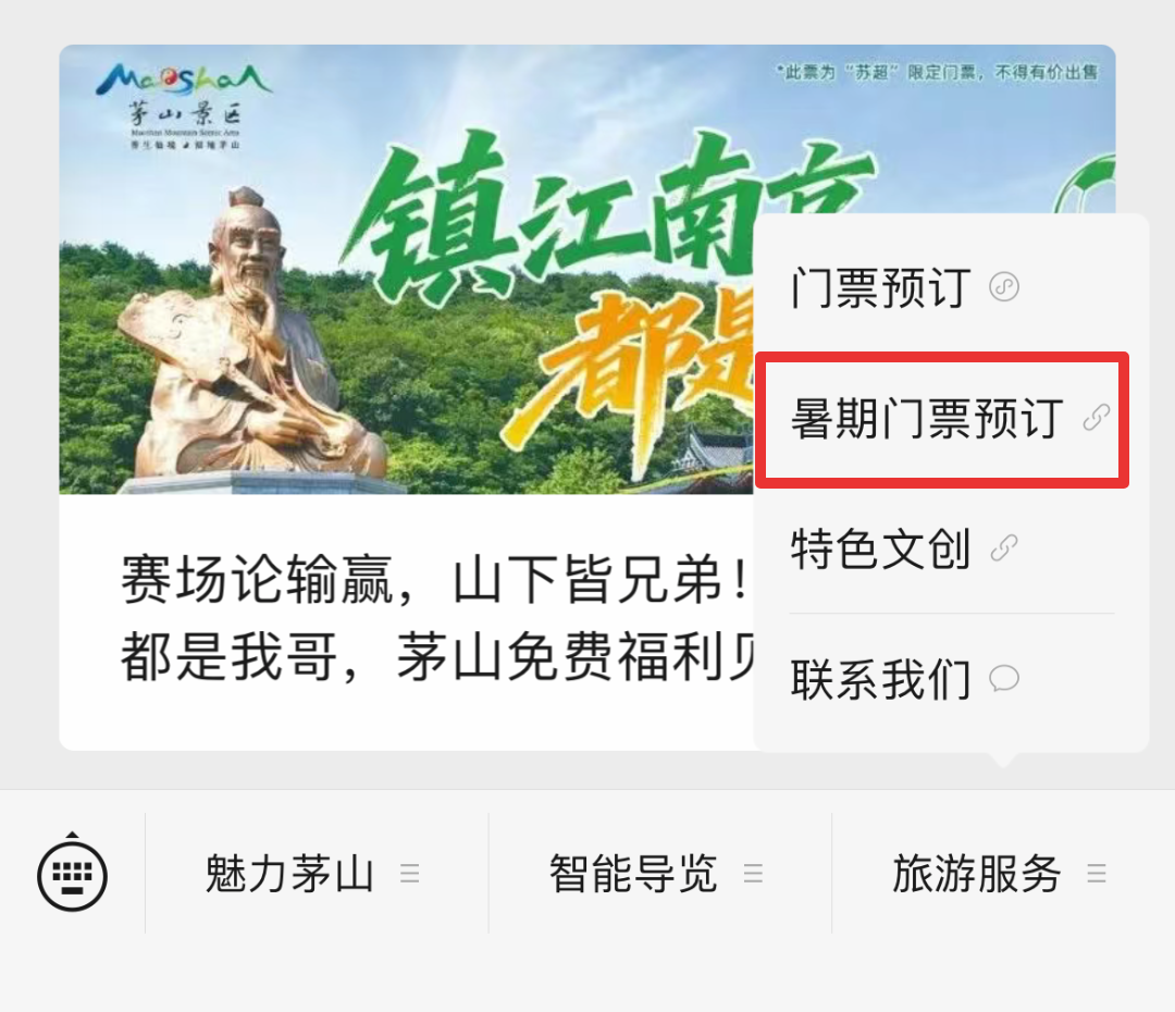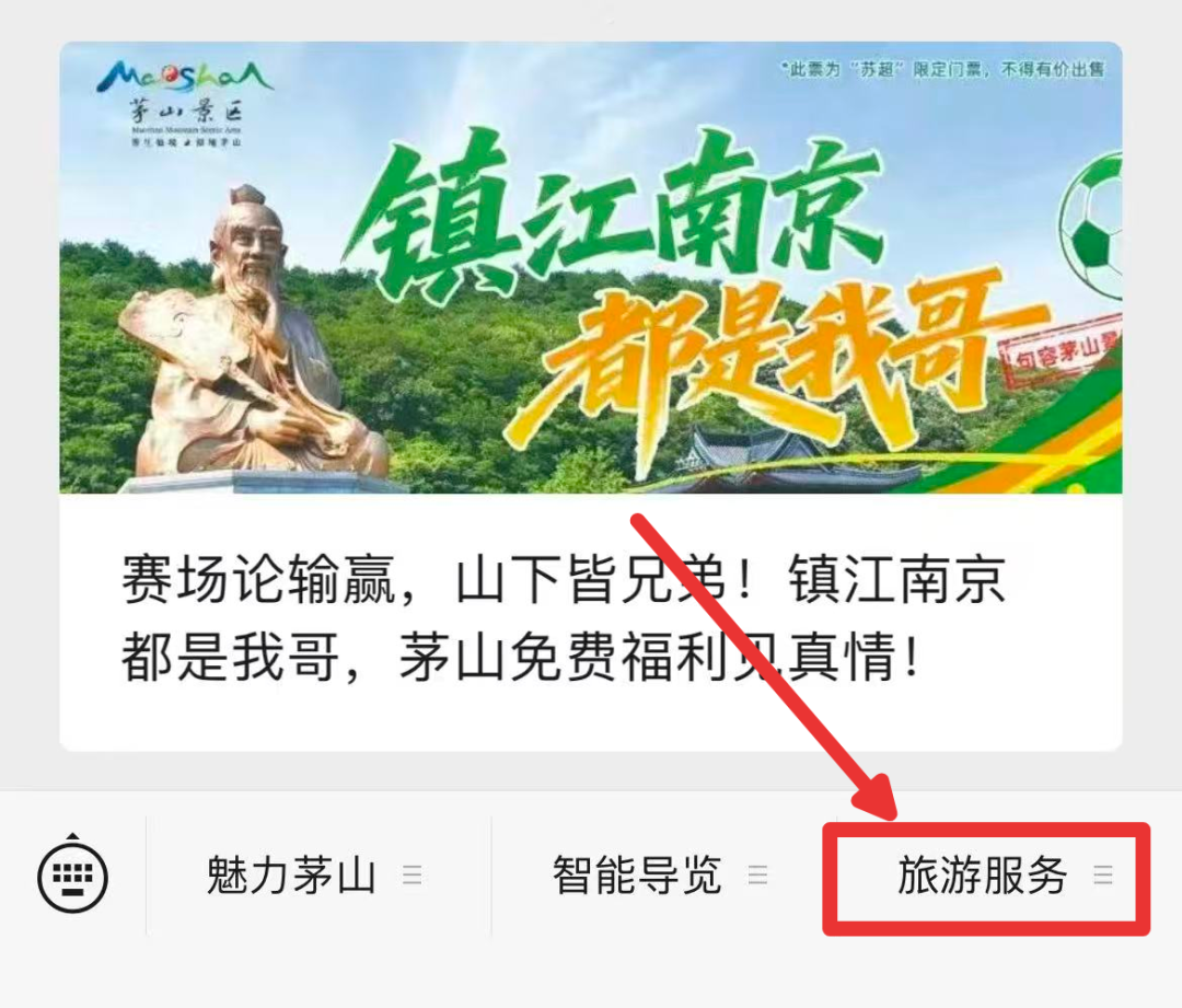 预约成功后,持“苏超”镇江VS南京 句容茅山特供版门票(该门票将随比赛现场大礼包一同送出)、本人身份证和8月31日“镇江VS南京”苏超比赛观赛二维码,至句容茅山景区售票窗口兑换实体票入园。