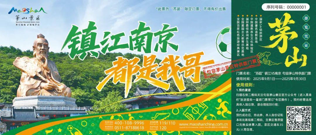 8月31日镇江vs南京比赛中,镇江队每进1球,句容茅山景区将面向全国游客赠送2000张免费门票