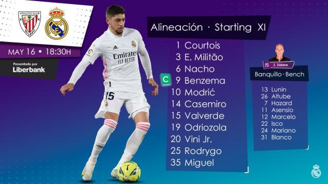 皇马首发:1-库尔图瓦/19-奥德里奥索拉、6-纳乔、3-米利唐、35-米格尔·古铁雷斯/15-巴尔韦德、14-卡塞米罗、10-莫德里奇/25-罗德里戈、9-本泽马、20-维尼修斯